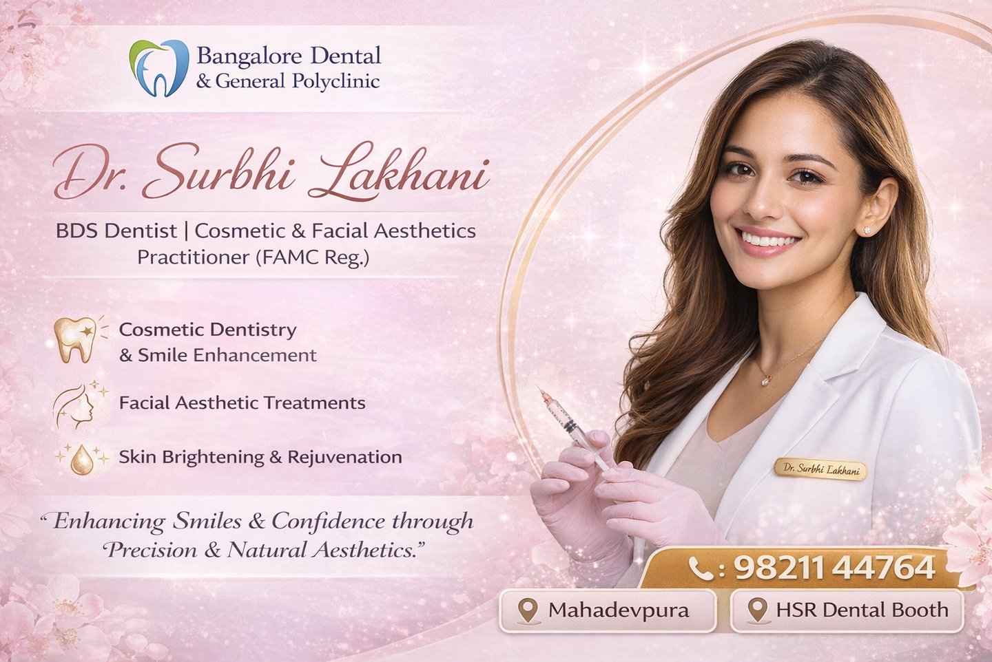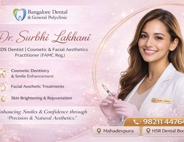 Dr. Surbhi Lakhani is a skilled and patient-focused dental professional, registered with the Karnataka State Dental Council (KSDC). She is the co-owner of Bangalore Dental & General Polyclinic, where she works alongside Dr. Akshim Sukhraj Lalchandani to deliver comprehensive and modern dental care.