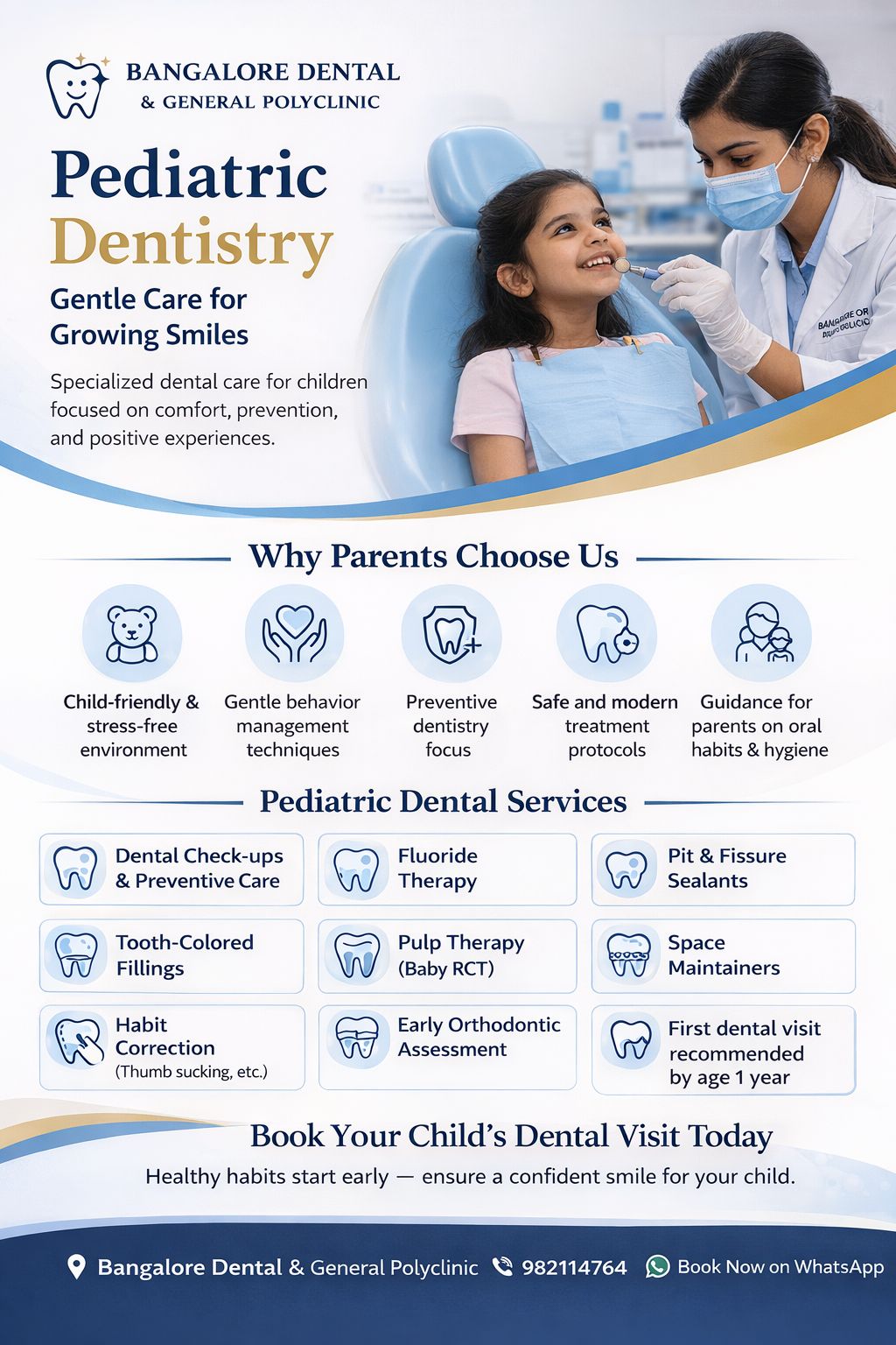 At Bangalore Dental & General Polyclinic, we provide dedicated pediatric dental care designed to ensure that every child receives treatment in a calm, safe, and reassuring environment.